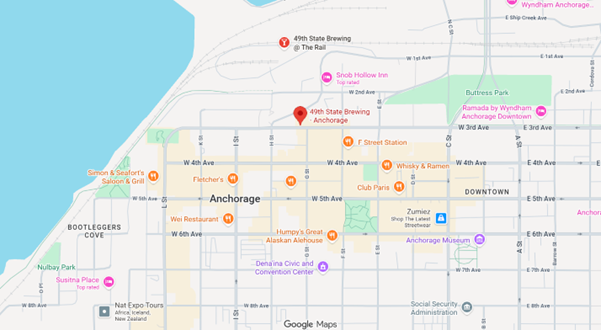 49th State Brewing Co is located in the heart of downtown Anchorage where there are museums, galleries, the 5th Ave shopping mall, movie theaters, Alaska Railroad, hiking, bike trails, mountains, the inlet and wild life viewing.