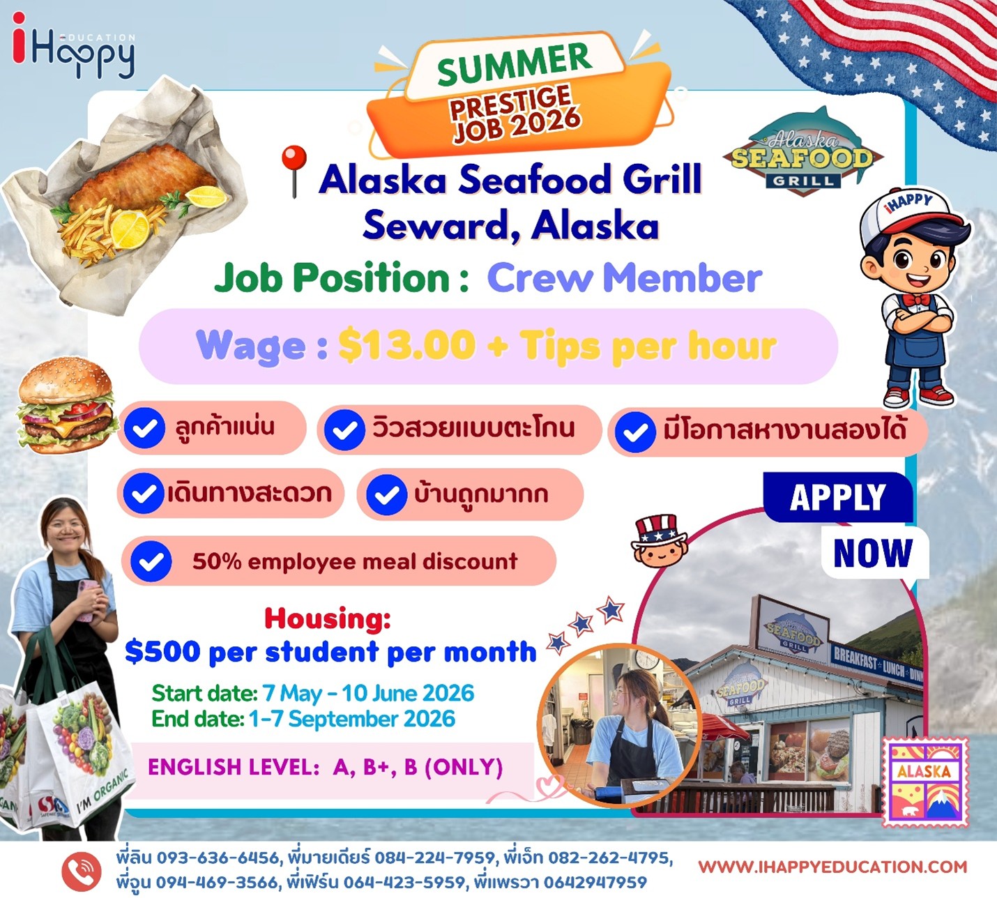 Choosing Alaska Seafood Grill for the Work and Travel program is an excellent opportunity to gain valuable experience in the food and hospitality industry while working in a welcoming, fast-paced environment. Students can develop important skills in customer service, teamwork, and food handling while learning about Alaska’s rich seafood culture. Located in one of the most scenic regions of the United States, participants can enjoy cultural exchange activities such as exploring local markets, visiting coastal attractions, and experiencing the beauty of Alaska’s wildlife and landscapes. It’s a great place to work, grow, and immerse yourself in a unique part of American culture surrounded by nature and adventure.