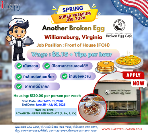 Choosing Another Broken Egg in Williamsburg, Virginia, for a Work and Travel program is an excellent opportunity for students to develop strong skills in customer service, teamwork, and food preparation while working in a friendly and supportive café environment. The restaurant offers a great setting to practice English, interact with diverse guests, and grow professionally in a historic and vibrant city. During free time, students can explore Colonial Williamsburg, enjoy local shops and museums, and participate in community events, creating a well-rounded experience that combines work, cultural exchange, and memorable sightseeing.