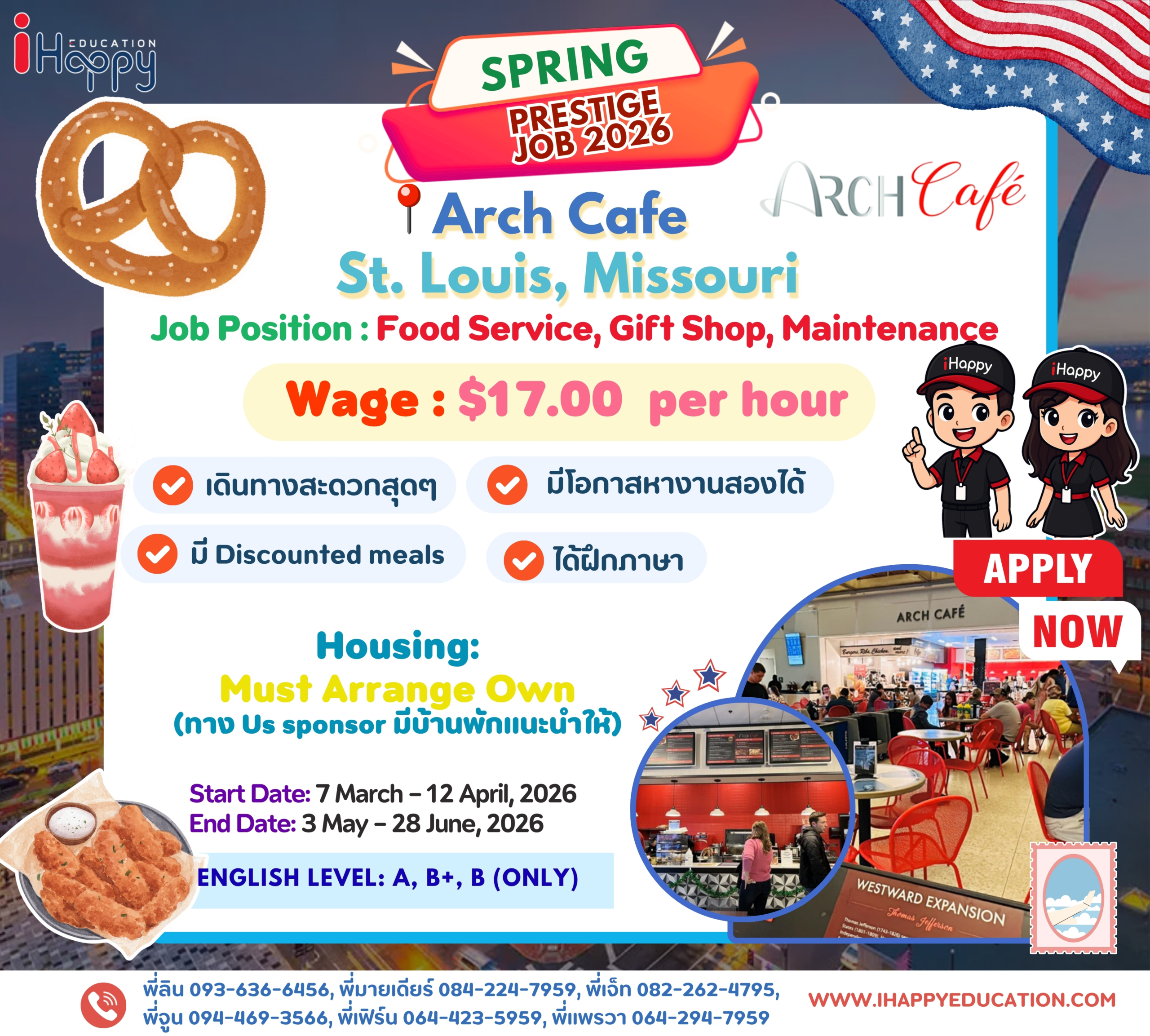 Advanced English. Must like working with the public, be outgoing, friendly, approachable, and helpful. Must be flexible and able to help out in other positions when requested by management. You must arrange your own housing in St. Louis.