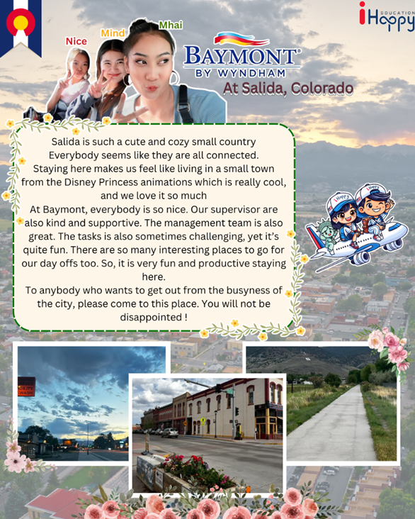 Choosing Baymont Inn in Salida, Colorado for the Work and Travel program is a great opportunity to gain real hospitality experience in both housekeeping and front-of-house roles. Students can improve their English, develop customer service skills, and learn teamwork in a supportive hotel environment. Located in a beautiful mountain town, Salida also offers chances to enjoy outdoor activities like hiking, rafting, and exploring local culture, making it a balanced experience of work and adventure.