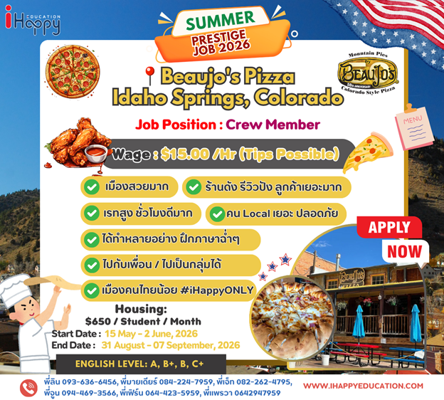 Choosing Beau Jo’s Pizza in Idaho Springs, Colorado for the Work and Travel Summer 2026 program is a great opportunity for students to experience American work culture in a friendly and lively environment. This restaurant is known for its famous Colorado-style pizza and welcoming staff, providing a fun and supportive workplace. Students can develop teamwork, customer service, and multitasking skills while serving both locals and tourists. Located in a beautiful mountain town, participants can also enjoy outdoor activities like hiking, exploring hot springs, and visiting nearby scenic spots — making it a perfect balance of work, learning, and adventure.