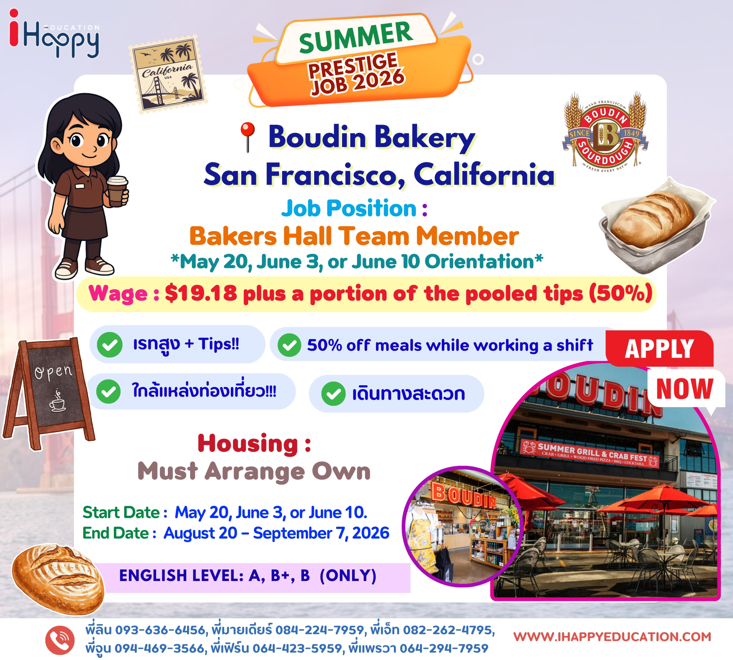 Boudin Bakery operates under union rules that do not allow seasonal Work & Travel employees to work more than 89 days from their first day of employment. You must commit to the full 89-day period with Boudin. Please plan accordingly. At Pier 39 only, this 89-day restriction does not apply. If you are assigned there, you may work longer than 89 days.