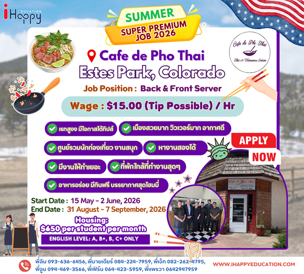 Choosing Café de Pho Thai in Estes Park, Colorado for the Summer Work and Travel 2026 program offers students a unique opportunity to gain experience in an authentic Asian restaurant located in a popular tourist destination. Participants can develop their customer service, communication, and teamwork skills in a friendly, fast-paced environment. Working here also allows students to meet people from diverse backgrounds, practice English daily, and enjoy the scenic beauty of the Rocky Mountains while exploring local culture and outdoor activities — creating a perfect balance between work and cultural exchange.