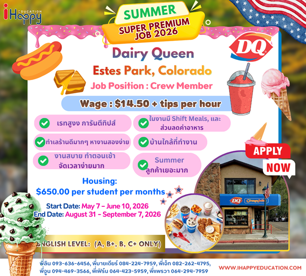 Choosing Dairy Queen for the Work & Travel Program offers international students a supportive and structured work environment where training is provided, and supervisors are available to assist with daily tasks. As a globally recognized brand, Dairy Queen allows students to gain valuable experience in American customer service and food safety standards while improving their English through regular interaction with customers and coworkers. The fast-paced, team-oriented workplace helps develop responsibility, communication, and teamwork skills, making it an excellent opportunity for cultural exchange and professional growth during the Work & Travel program.
