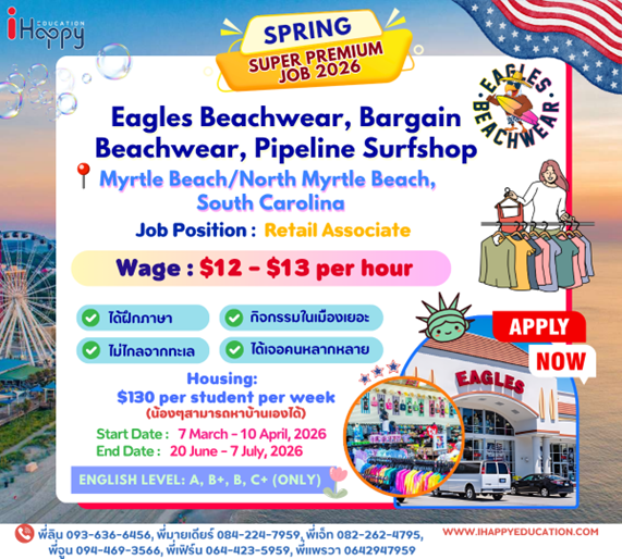 Employer Name: Eagles Beachwear, Bargain Beachwear, Pipeline Surfshop (ทางนายจ้างจะเป็นคนเลือกที่ทำงานให้)