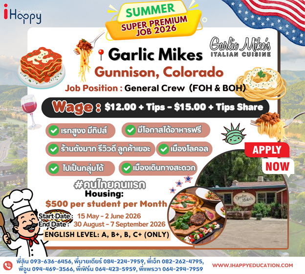 Choosing Garlic Mike’s in Gunnison, Colorado for a Work and Travel program is a great opportunity to gain hands-on experience in a well-known Italian restaurant with a friendly and supportive environment. Students can learn about American dining culture, improve customer service and teamwork skills, and practice English with both coworkers and guests. Located in a beautiful mountain town, participants can also enjoy outdoor activities like hiking, biking, and exploring nature during their free time, making it a perfect balance of work, learning, and adventure.