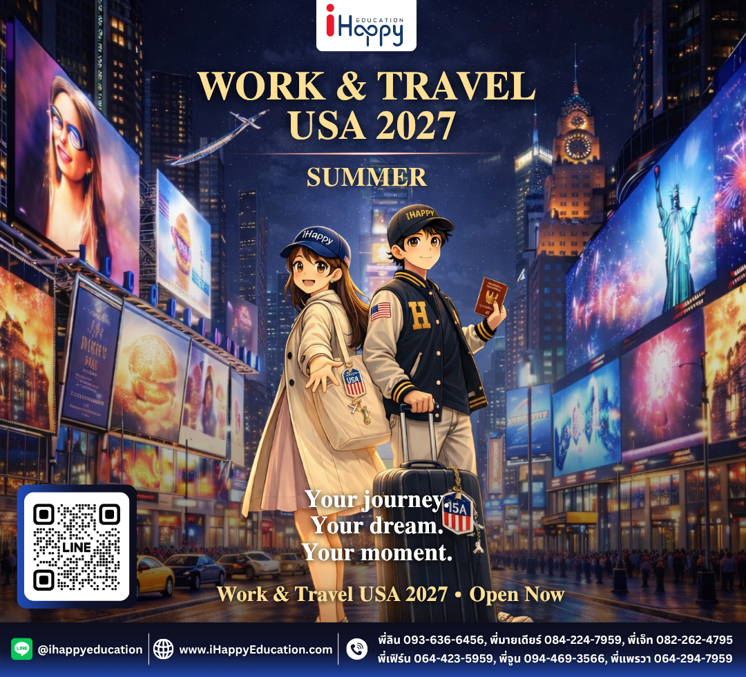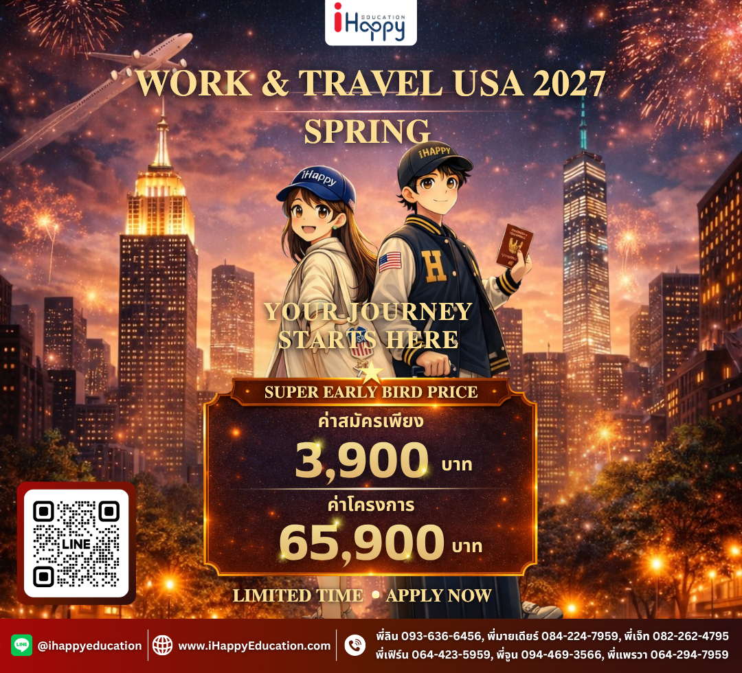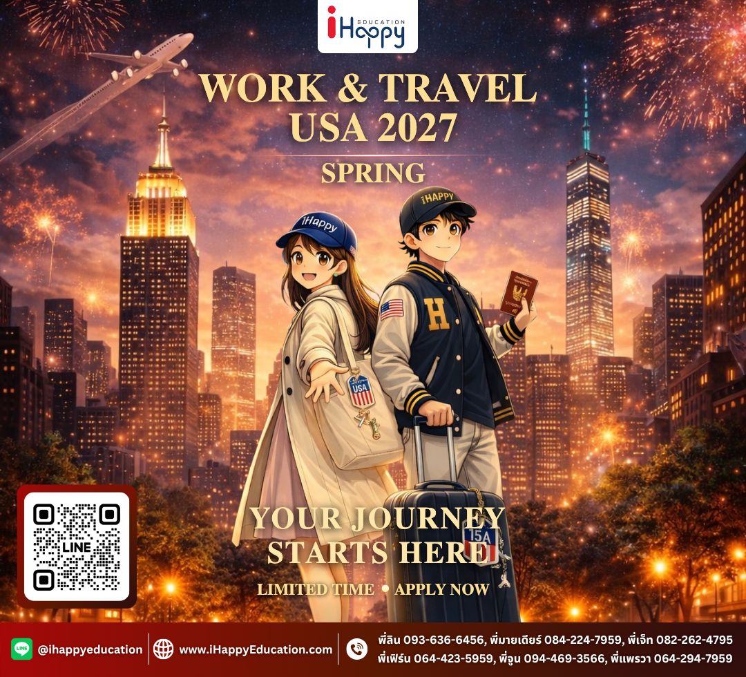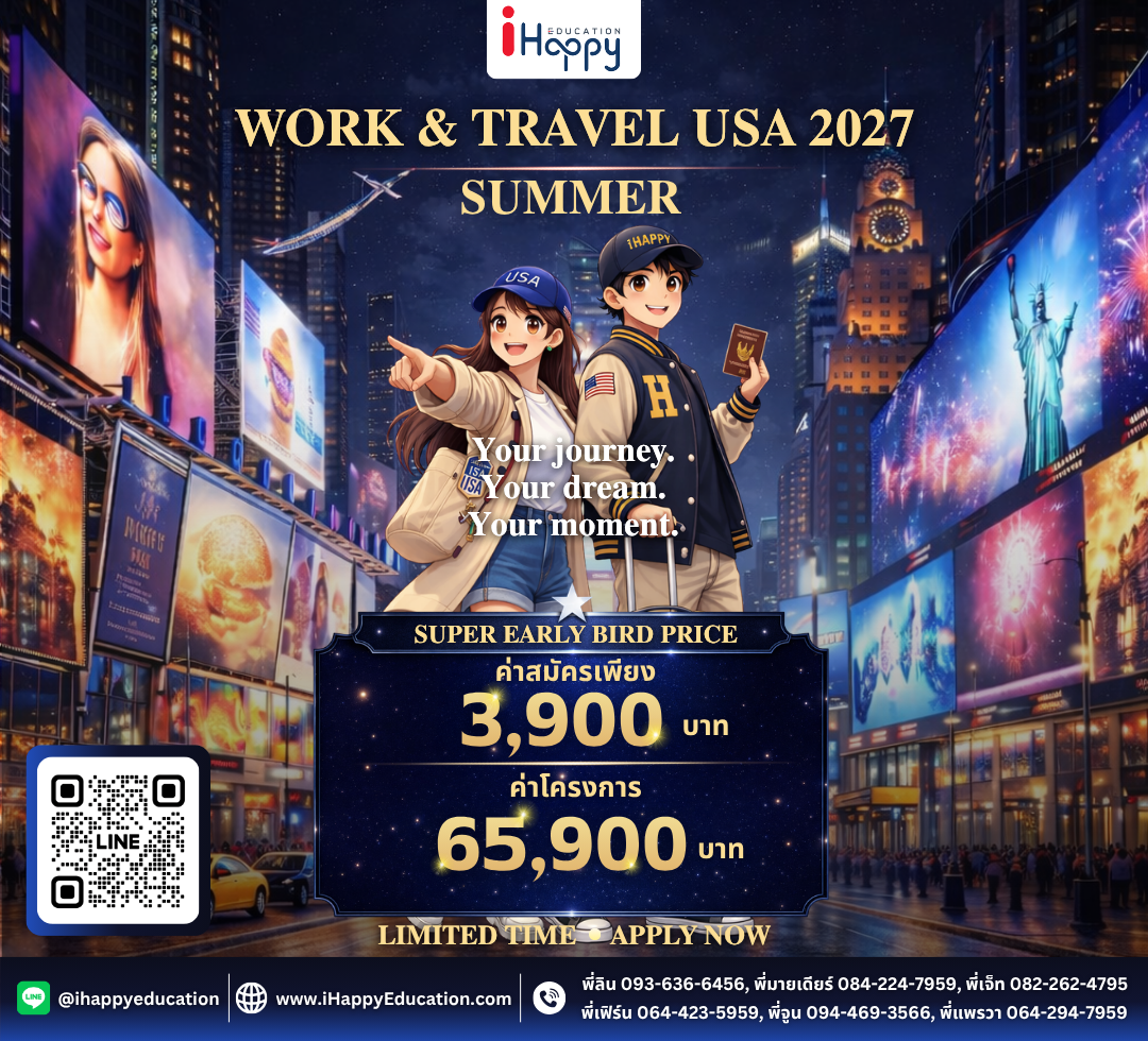โครงการ Work and Travel 2027 โปรโมชั่นสุดพิเศษ!! โอกาสดี ๆ สำหรับน้อง ๆ ที่ต้องการฝึกภาษา หาประสบการณ์และท่องเที่ยวในประเทศสหรัฐอเมริกามาแล้วจ้า… พิเศษสำหรับน้อง ๆ ในปีนี้ iHappy คัดมาแล้ว งานคุณภาพล้วน ๆ ค่าตอบแทนสูง รวยไม่ไหว make money สุด ๆ