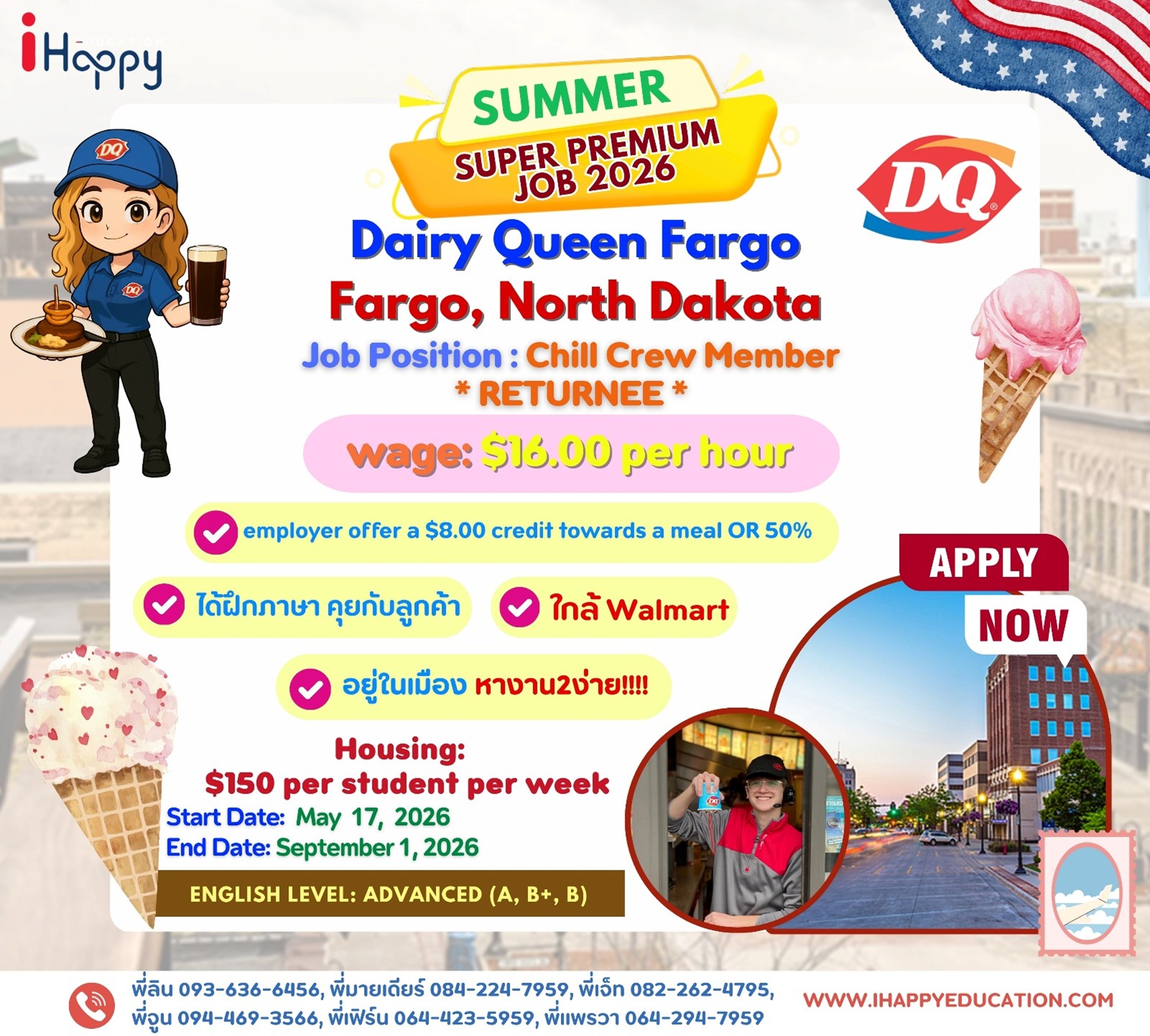 Job Descriptions: Join the team at Dairy Queen Fargo, where you’ll work in a dynamic and fast-paced ice cream and quick-service restaurant environment. Participants will perform a variety of customer service and food preparation tasks while ensuring guests have a positive experience. Key Responsibilities Greet customers warmly, take food and beverage orders, and handle payments accurately. Prepare burgers, sandwiches, beverages, and Dairy Queen treats such as sundaes, cones, and Blizzards. Assist with daily setup, restocking supplies, and food prep as needed. Maintain a clean and organized work area, including dishwashing, emptying trash, cleaning bathrooms, and keeping the dining area tidy. Support drive-thru operations when assigned, ensuring friendly and efficient service. Follow all food safety, sanitation, and health standards. Perform additional tasks as requested by management and assist teammates in other areas when needed. Expectations Must be dependable, hard-working, and honest. Demonstrate punctuality, attention to detail, and a strong team spirit. Provide outstanding customer service and maintain a positive attitude at all times. Must be flexible to help in various positions as business needs change. Work schedules will include evenings, weekends (Friday–Sunday), and holidays. If you call out sick or miss shifts, the employer is not required to schedule additional hours that week. Shifts may not align with friends’ schedules; you may not have the same days off. Hours may vary weekly based on business demand — some weeks may be slower than others. You may not miss scheduled shifts due to another job or online classes. Familiarity with U.S. currency and credit card transactions is helpful for this role. Job Requirements Must be physically able to stand for long periods and work in a fast-paced environment. Able to lift up to 30 lbs (13.6 kg). Must maintain a neat and clean appearance according to company policy. Comfortable handling food and working around hot equipment and cleaning supplies. Must have good English communication skills for customer interaction and understanding instructions. Must be reliable and willing to follow supervisor directions.