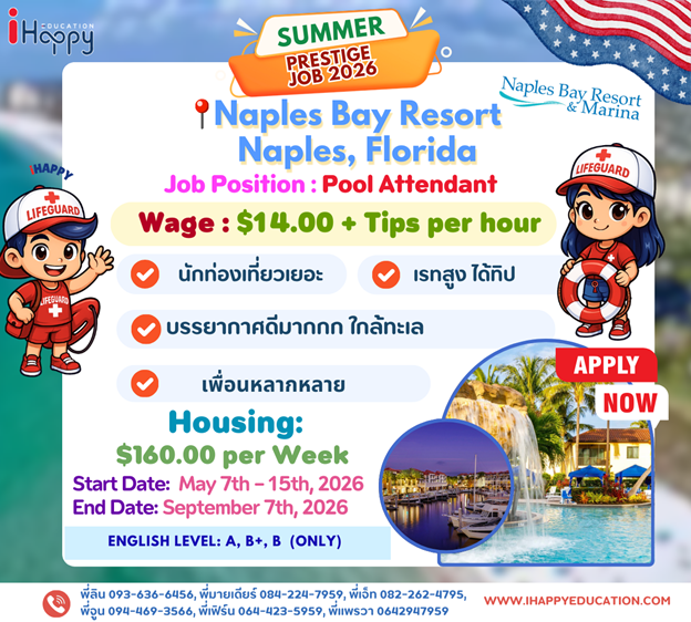 Choosing Naples Bay Resort & Marina is an excellent opportunity for Work and Travel participants who want to combine professional hospitality experience with coastal Florida’s relaxed resort lifestyle. Working at the resort gives students hands-on exposure to guest services, resort operations, and teamwork in a high-end environment enhancing customer service skills, work ethic, and communication in English. The resort’s beautiful waterfront setting, full-service amenities, and vibrant atmosphere offer a unique backdrop for learning about American hospitality standards and running a guest-focused operation. During free time, participants can enjoy beaches, boating, resort pools, nearby attractions, and the lively local culture crafting a rich experience of work, leisure, and cultural exchange.