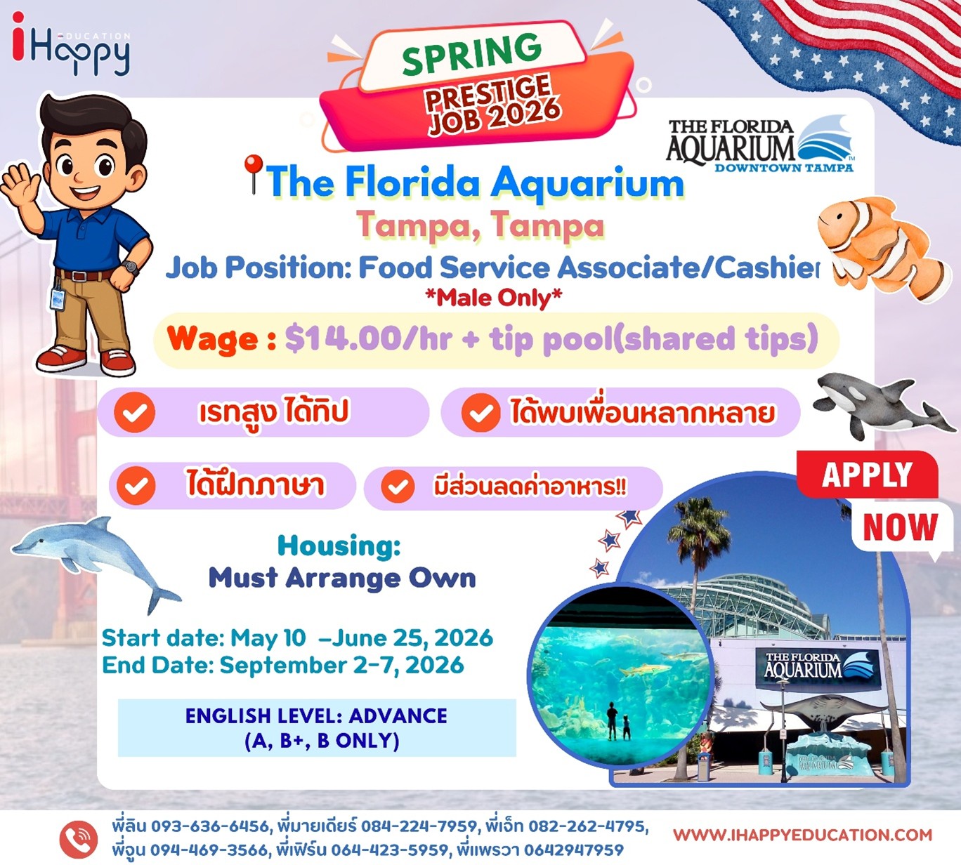 Must have advanced English and Comprehension and be able to stand for the entirety of their shift. Strong interpersonal and communication skills, exceptional problemsolving/decisions making skills combined with the ability to be organized. Must be able to work at a fast pace, team player, and work various hours/days. Must be comfortable handling American currency. **SOCIAL SECURITY NUMBER IS REQUIRED** ** Must arrange your own housing** ** SSA Tampa Aquarium only accepts 2 J1 Work Travel participants per season and because of this we recommend this position for friend groups only or 2 applicants of the same gender and from the same agency in order to find affordable housing.