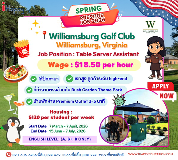 Working at Williamsburg Golf Club is a great opportunity who want to gain professional experience in a high-end and friendly environment. The club offers a peaceful atmosphere surrounded by beautiful nature, working in a professional setting and learning the standards of fine dining service. It is also a great place to build teamwork and cross-cultural communication skills by working alongside local and international coworkers. Located near Virginia Beach and Busch Gardens Theme Park, Williamsburg is a charming and historical city with many attractions to explore during free time. Overall, this experience not only enhances professional skills but also adds great value to future career opportunities.